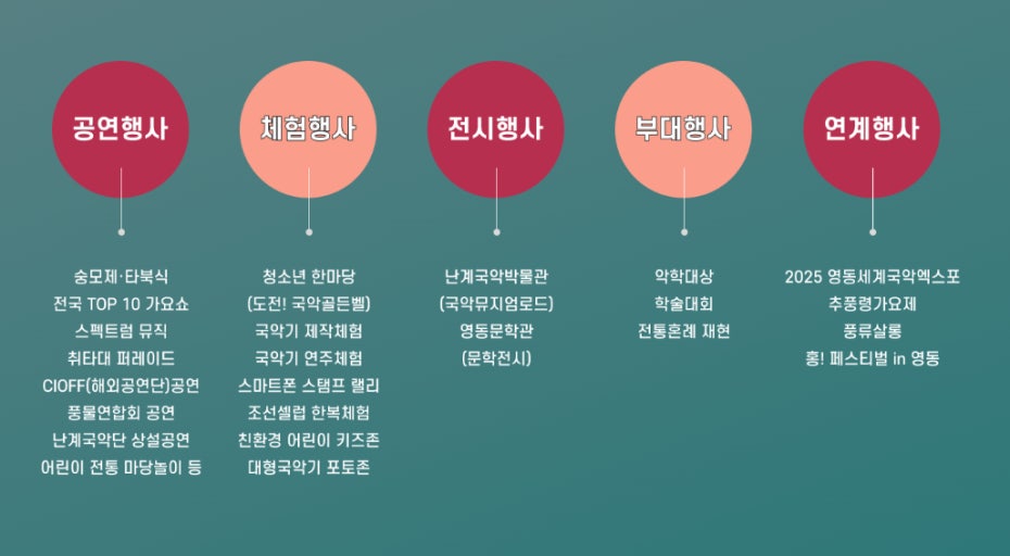 - 장소: 충북 영동군 영동천 일원, 난계국악당, 난계국악박물관 등