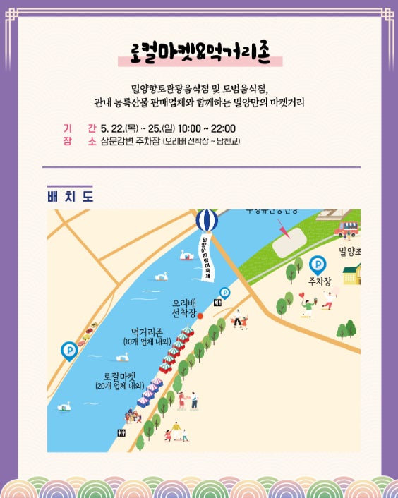 - 장소: 영남루, 밀양강변, 남천강변로, 내일동 상가 일원