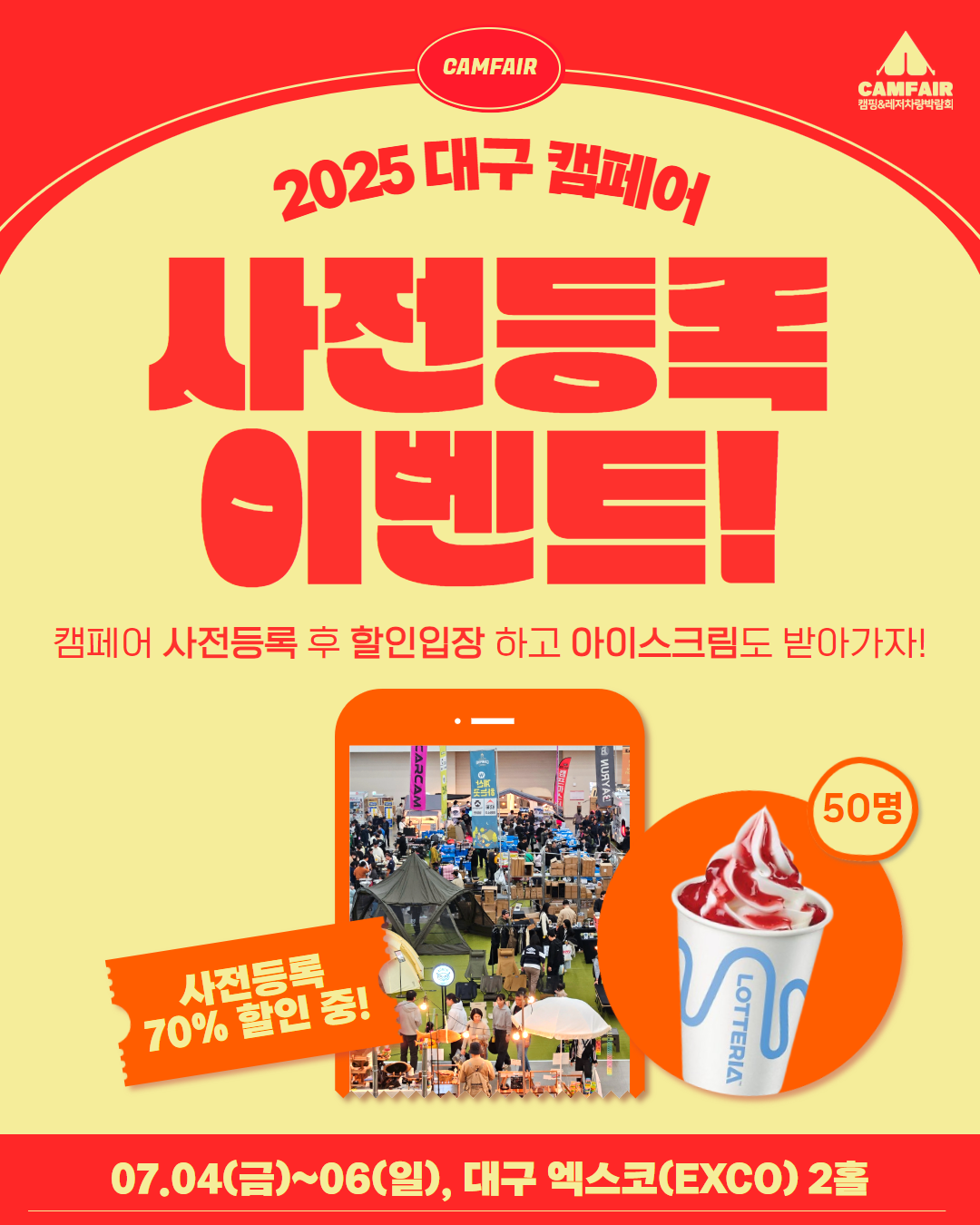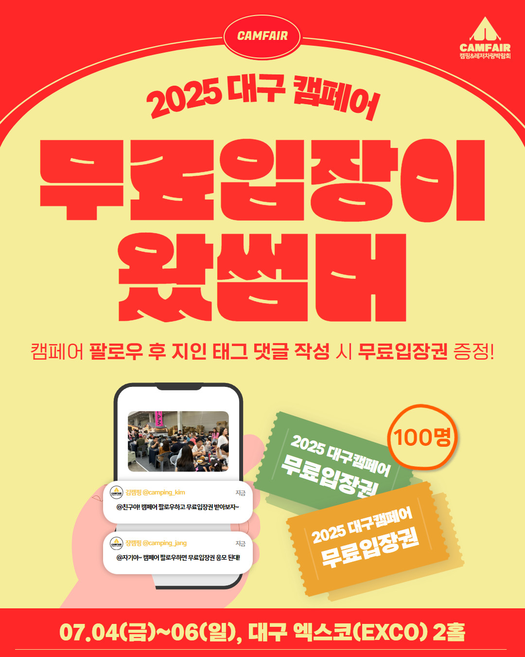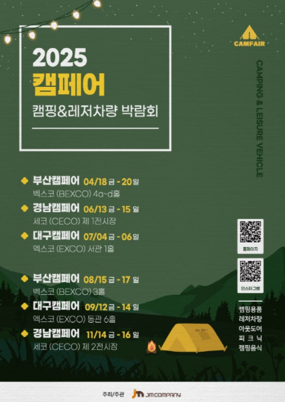 2025 캠페어 대구(CAMFAIR)는 캠핑을 사랑하는 사람들을 위한 대규모 캠핑 박람회입니다. 캠핑 용품, 카라반, 차박 용품, 아웃도어 브랜드, 캠핑 푸드까지 한자리에 모입니다. 캠핑 초보부터 전문가까지 모두를 위한 최적의 공간으로, 최신 캠핑 트렌드를 체험할 수 있는 최고의 박람회입니다.