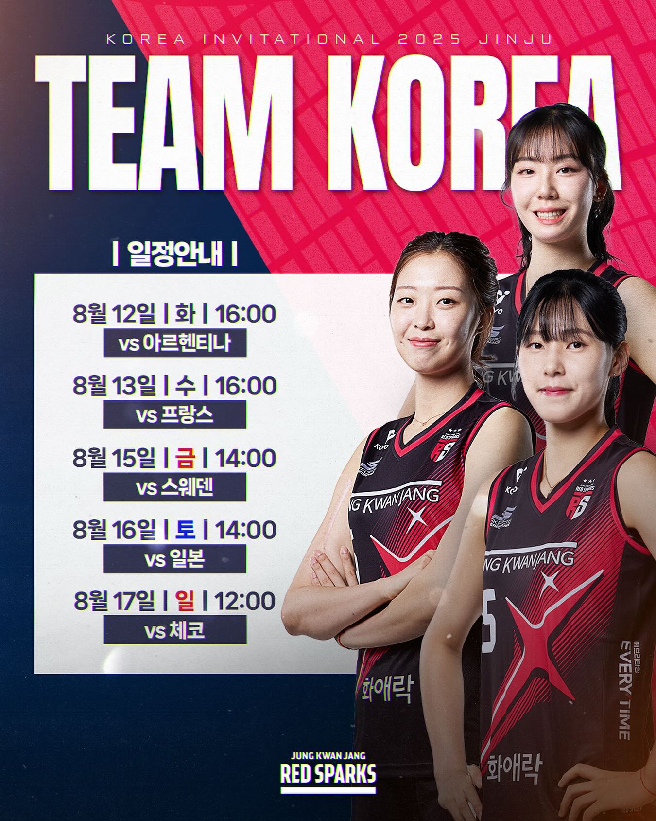 다음은 2025 코리아 인비테이셔널 진주 국제여자배구대회에서 **한국 대표팀(Team Korea)**의 경기 일정을 정리한 내용입니다. 대회 기간 중 한국 대표팀의 경기 일정과 상대, 시간대를 한눈에 확인하실 수 있습니다.