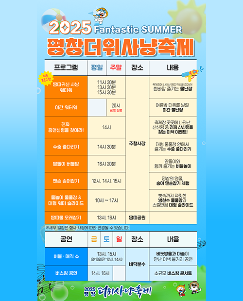 특징: 더위를 날리는 시원한 물놀이 중심의 체험 축제, 전 연령층에게 적합한 콘텐츠 구성입니다