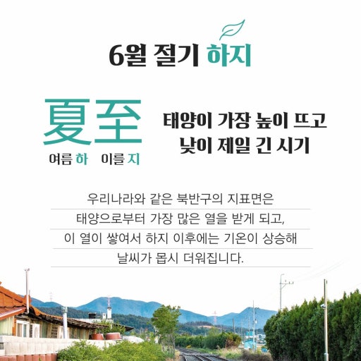 - 그러나 하지가 연중 가장 더운 날은 아니며, 기온은 이후 삼복더위(7~8월)를 향해 점차 상승합니다.