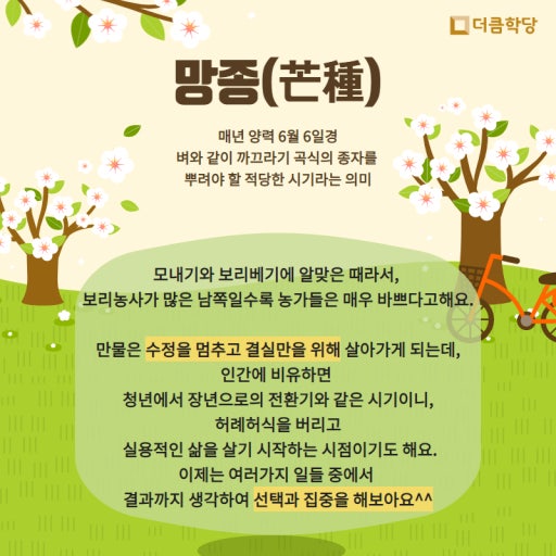 • : 망종이 지나면 농사일이 급해져서 발등에 불이 떨어진 듯 서둘러야 한다는 의미입니다.