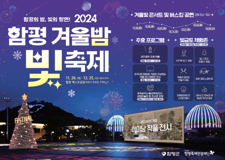 2025함평 겨울빛축제 ‘함평 겨울빛축제’는 국향대전에서 활용한 대형 조형물과 엑스포공원 야간 경관조명을 활용한 새로운 겨울철 축제입니다. 다양한 즐길거리와 크리스마스 체험 부대행사